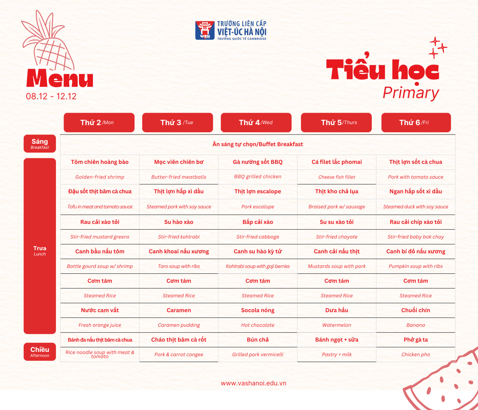 [Tiểu học] Thực đơn từ 08/12/2025 - 12/12/2025