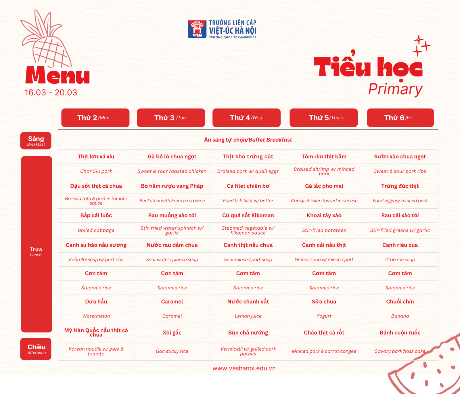 Thực đơn Tiểu học từ ngày 16/03/2026 - 20/03/2026