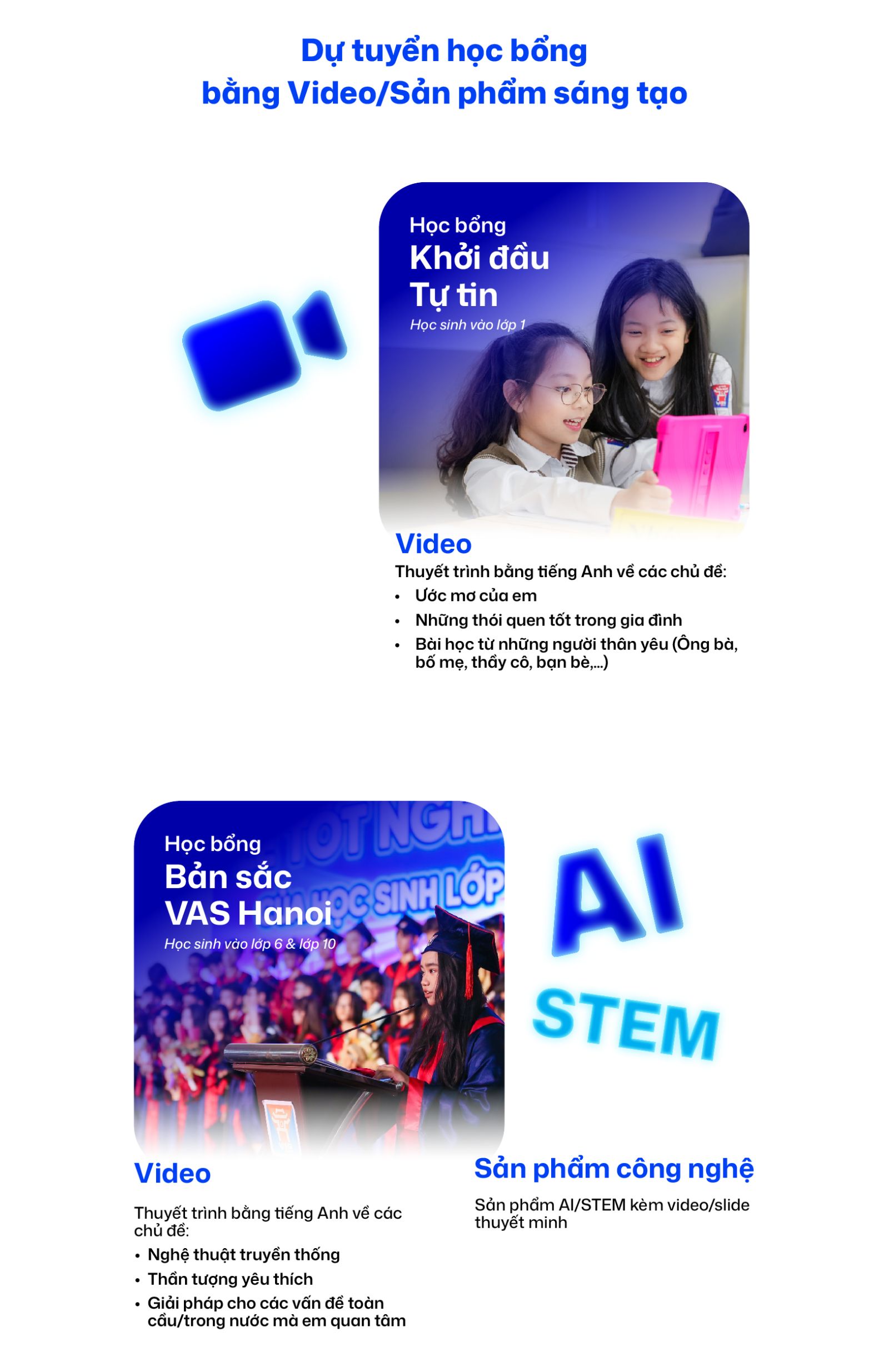 Tại VAS Hanoi, học bổng không chỉ là sự ghi nhận thành tích, mà là sự cổ vũ cho tinh thần "dám thể hiện, dám khác biệt và dám theo đuổi đam mê". Hình thức "thi học bổng" của chúng tôi được xây dựng như một hành trình trải nghiệm, nơi học sinh được thể hiện bản thân qua các dự án cá nhân, bài phỏng vấn và video sáng tạo, thay vì những kỳ thi áp lực truyền thống.