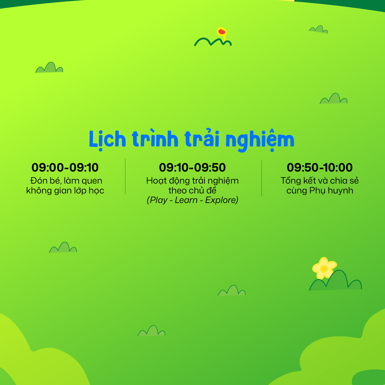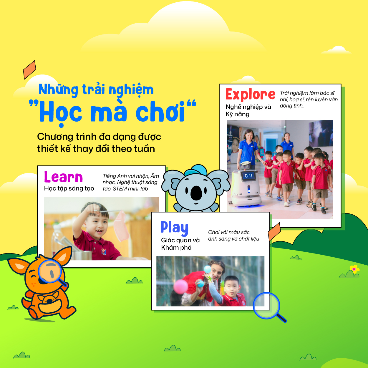 Mỗi buổi trải nghiệm được xây dựng theo ba trụ cột chính, giúp bé phát triển đa giác quan: