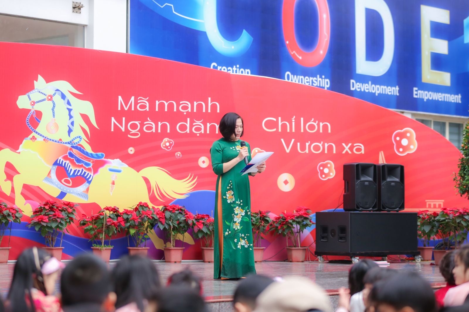 Chủ đề “Sắc xuân 3 miền - Chí mã vươn xa” được lồng ghép xuyên suốt chương trình như một lời chúc đầu năm đầy ý nghĩa. Hình ảnh “chí mã”, chú ngựa mang tinh thần mạnh mẽ, bền bỉ và không ngừng tiến về phía trước – tượng trưng cho ý chí, nghị lực và khát vọng vươn xa của mỗi học sinh VAS Hanoi trong hành trình học tập và trưởng thành. Đó cũng là tinh thần mà nhà trường mong muốn nuôi dưỡng: bản lĩnh, tự tin, giữ gìn giá trị truyền thống nhưng luôn sẵn sàng hội nhập và bứt phá trong tương lai.