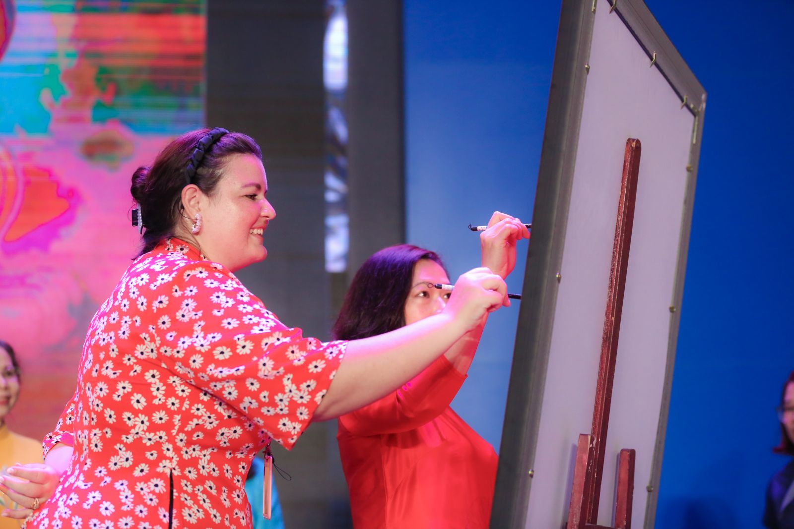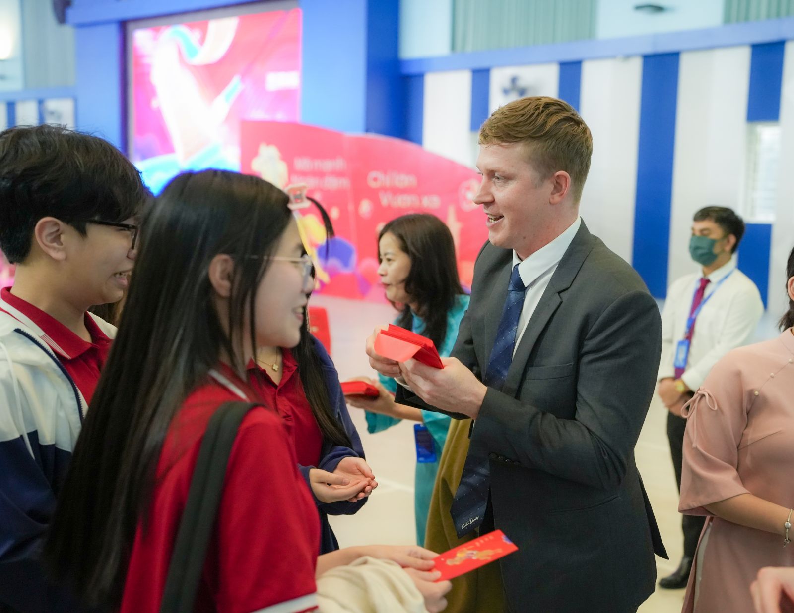 Điểm nhấn trang trọng của chương trình là nghi thức khai bút đầu xuân. Trong sự chứng kiến của toàn thể cán bộ, giáo viên và học sinh, Ban Lãnh đạo, Ban Giám hiệu, Hội đồng Cố vấn, Quản lý Chương trình Quốc tế cùng đại diện học sinh đã cùng nhau viết nên thông điệp của năm mới: