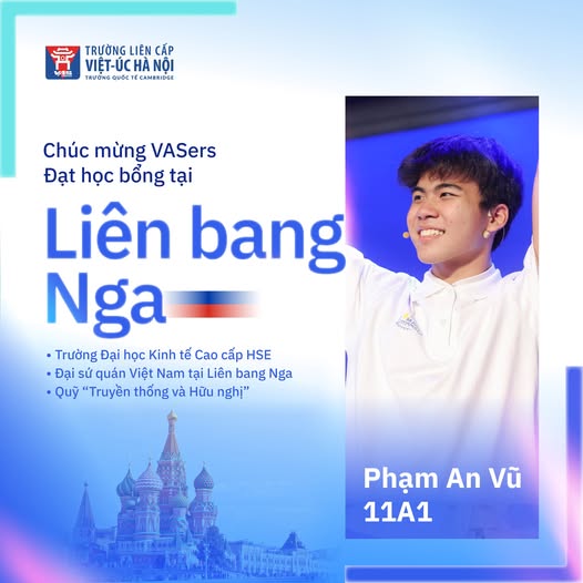 Phạm An Vũ đã giành được học bổng thuộc chương trình hợp tác giữa Đại học Kinh tế Cao cấp HSE - một trong những trường đại học hàng đầu nước Nga, Đại sứ quán Việt Nam tại Liên bang Nga và Quỹ Truyền thống và Hữu nghị. Thành tích này không chỉ là dấu mốc đáng tự hào đối với cá nhân An Vũ mà còn là niềm vui lớn của thầy cô và bạn bè VAS Hanoi trong những ngày đầu năm mới.